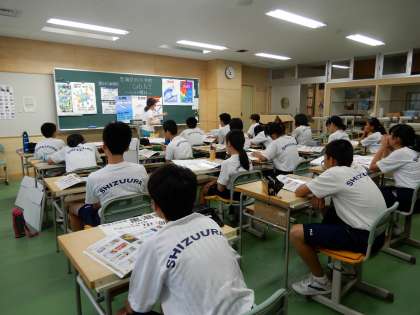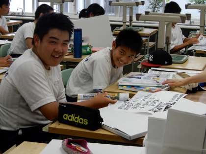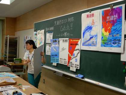 黒潮祭のポスターについて丹羽先生から説明を受けています。