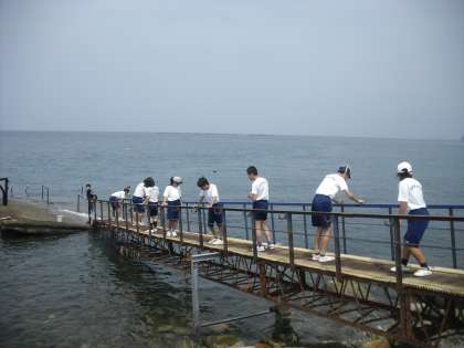 ダイビングショップ「シーマンズ」にて、東海大学の中島匠先生、学生5名の方々の指導により、サンゴの植え付けを行いました。最初に海水を汲んで、その中で植え付けをしました。植え付け後、中島先生が、生徒の質問に答えてくれました。