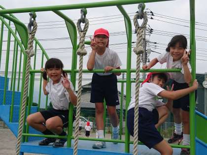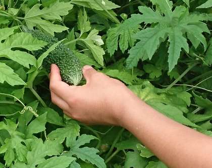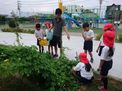 朝の活動の様子です。育てているゴーヤも大きくなってきました。