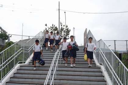 部活動を終えた7〜9年生が大グラウンドから戻ってきました。部活を終えた9年生と登校してきた1年生が一緒にカメラにおさまりました。