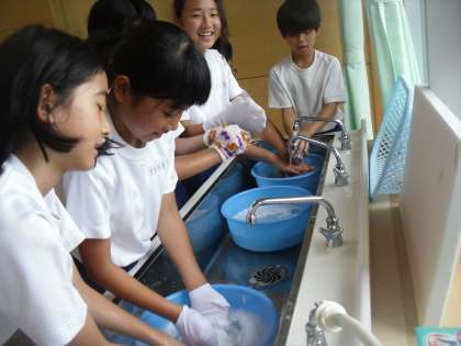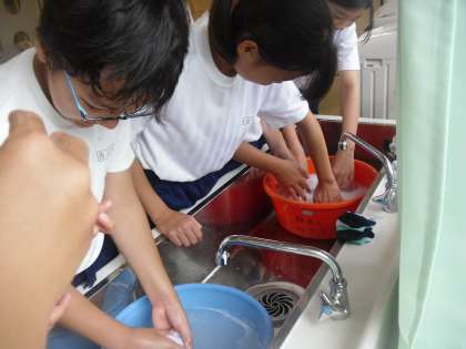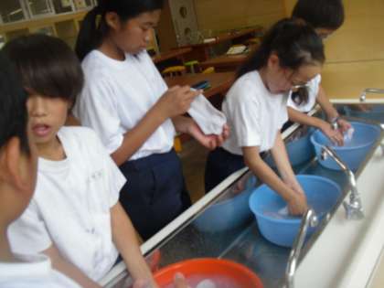 6年生は家庭科で洗濯実習を行いました。自分の靴下を「もみ洗い」「つまみ洗い」できれいにしました。