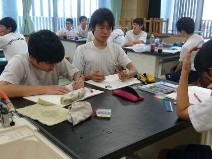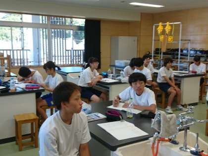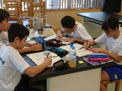 9年生は理科で「水溶液とイオン」を学習しています。今日は、電気が通る水溶液の仕組みの共通点を考えました。