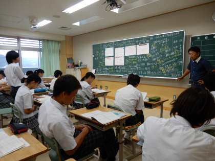 崇範先生の公民の授業ですが、社会科ルームで前時の板書を見ながら話し合っています。