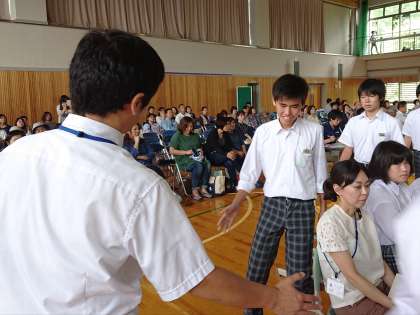 9年生合唱を前に青木先生が子どもたちに声をかけ送り出しました