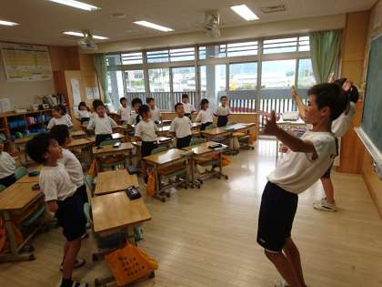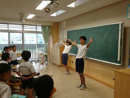 黒潮祭体育の部に向けて応援練習を行っています。上級生が元気なかけ声で下級生を鼓舞しています。