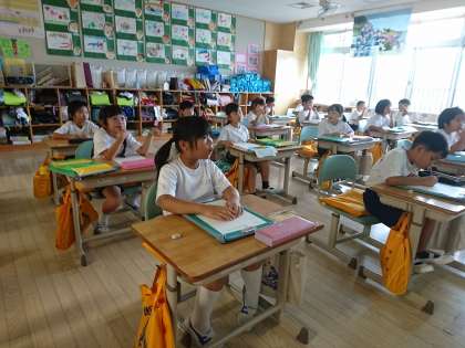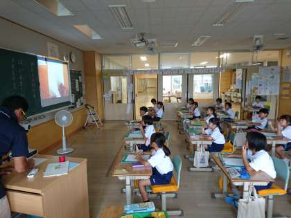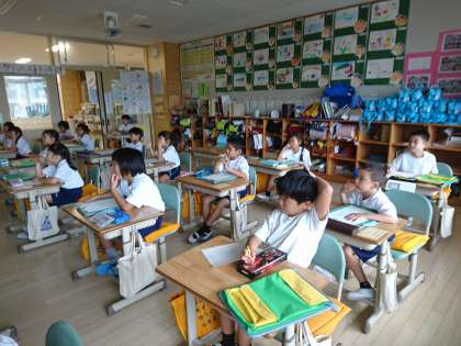 1年生は国語で「わたしのはっけん」という教材を学習しています。子どもたちは、探検に出かける前に、「見つけた場所」「いろ」「かず」「おおきさ」「かたち」を意識して観察することを確認しました。