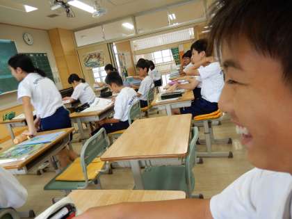 アジア州について学習しています。ドバイの町がプロジェクターで写されています。社会科教室を上手に活用しています。