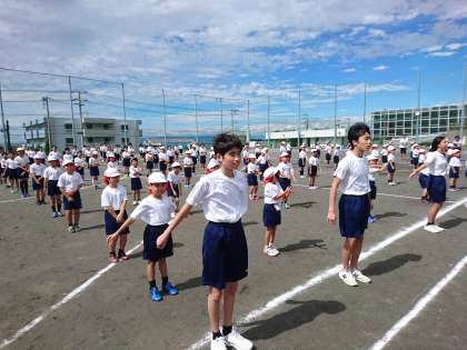 ラジオ体操の隊形は、8・9年生のお兄さん、お姉さんが先頭に立ち、下級生のよい手本になっています。