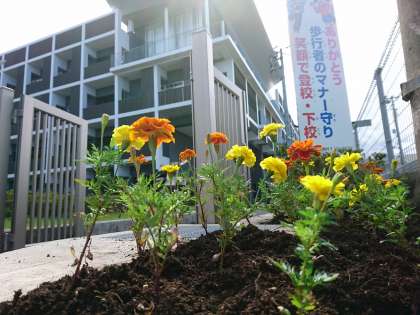 ボランティアの児童生徒が正門前や静浦の森(中庭)の花壇にマリーゴールドを丁寧に植えています。校内が花いっぱいになり、とても素敵な気持ちになります。
