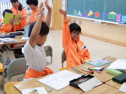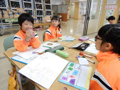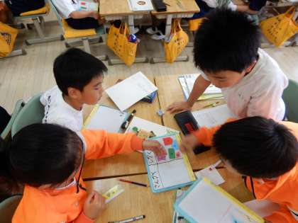 グループで話し合いながら、三角形と四角形のかたちの分類をしています。