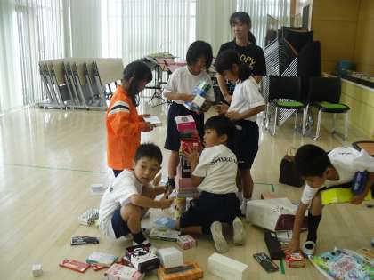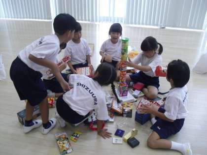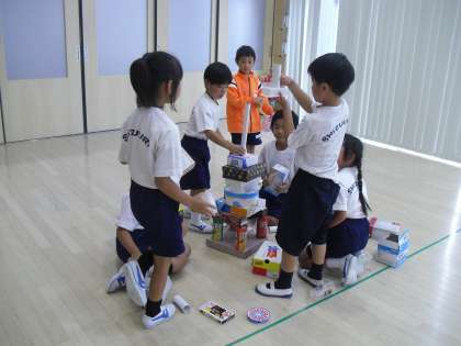 「どうやったらくずれないで高くつむことができるのかな?」を学習課題に、各グループごと活発にアイデアを出し合っています。