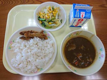 今日の給食の献立 米飯 牛乳 カレー きびなごフライ ほうれん草とコーンのサラダ