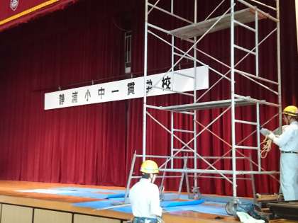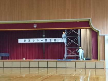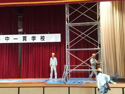 朝から体育館ステージ照明の取り替えを業者の方が行っています。