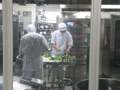 ただいま給食準備中です。栄養士さんや調理師さん、調理員さんがチームとなって子どもたちの給食を作っています。
