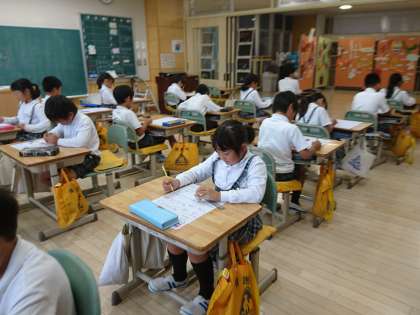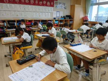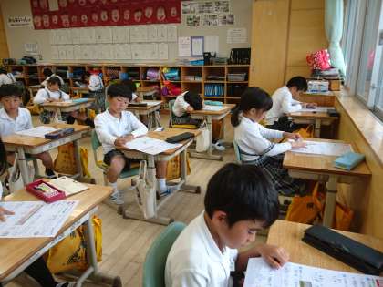 3年生は算数で「かけ算の筆算」を学習しています。既習事項の確認のために単元テストを行っていました。