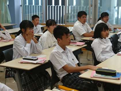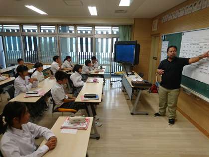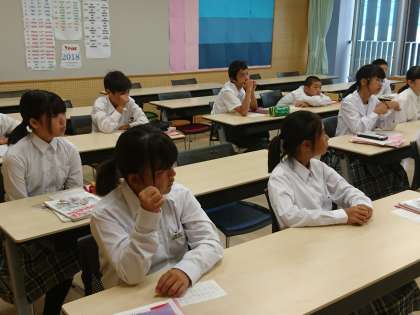 7年生は英語でALTと一緒に発音練習を行っていました。生徒はネイティブの発音を繰り返し発音しながら定着を図っています。
