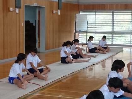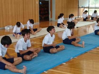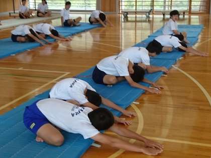 9年生は体育でマット運動を行っています。最初にストレッチ運動を行い、体をほぐしています。