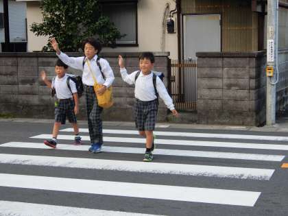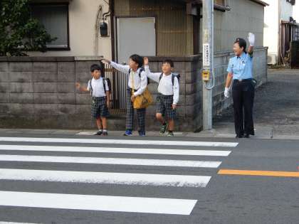 沼津警察署の署員の方が、交通安全指導に来てくださいます。時々、赤信号でも通過する車があります。信号機だけに頼らず、渡る前に左右の確認を必ずしましょう。