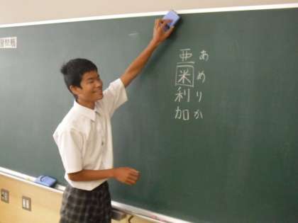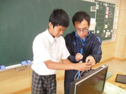 道徳の授業が終わった後、先生と協力して片づけをしています。