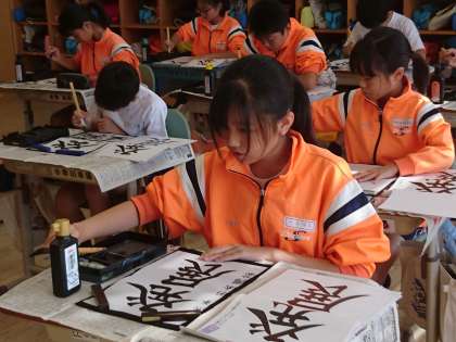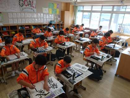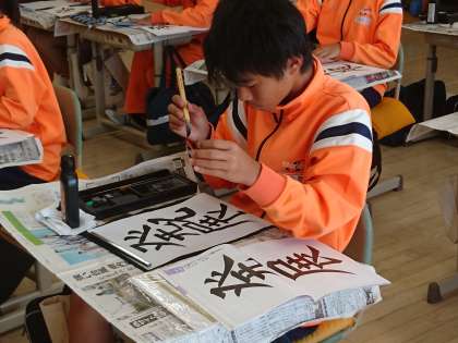 6年生は書写の時間に毛筆で「発展」という字を練習しました。