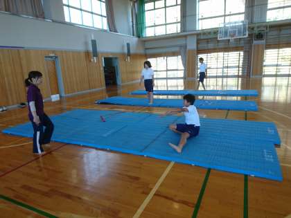 中C組は体育でマット運動を行っていました。前転、後転、開脚前転、開脚後転の4種目を練習していました。