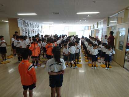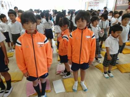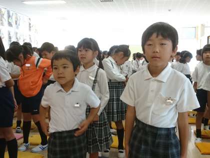 今朝、初志部集会が開かれました。歌を歌った後、服装チェックをしています。