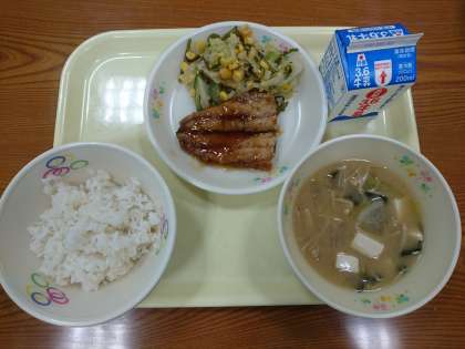今日の給食の献立 米飯 牛乳 秋刀魚の蒲焼き 茎わかめサラダ えのきと豆腐のみそ汁