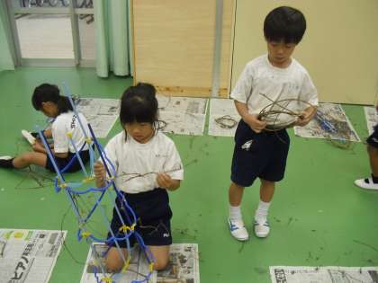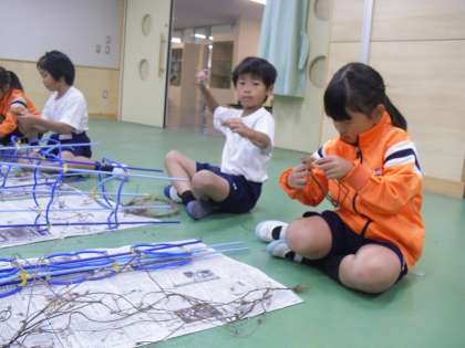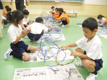 自分たちが育てたアサガオのつるで、リースづくりにチャレンジしています。一人一人個性的な作品ができあがってきています。