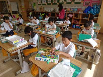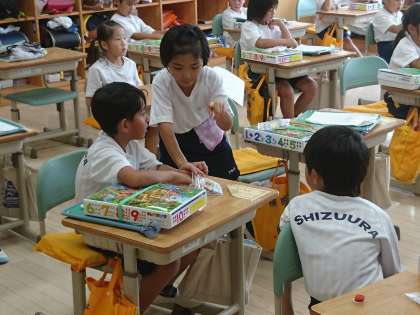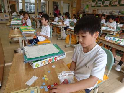 1年生は生活で「あわしまマリンパークへ行こう」という単元を学習しています。最初に模擬のお金を使って、バス代金の確認をしました。