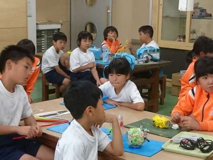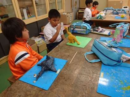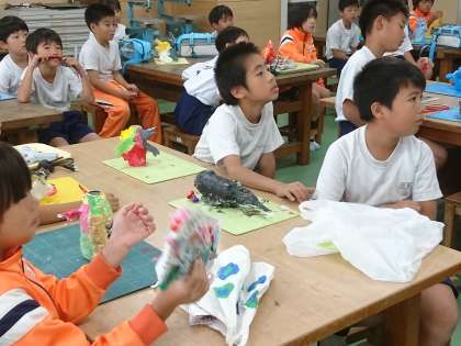 3年生は図工で「鳴き声図鑑」という教材を学習しています。紙粘土で作った動物にホットボンドで飾り付けをしていきます。