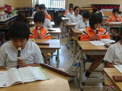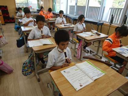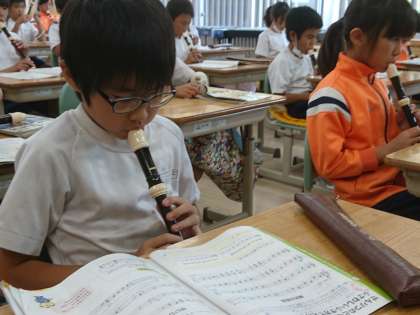 4年生は音楽で「旋律の特徴にふさわしい吹き方で演奏しましょう」という教材を学習しています。リコーダーで「陽気な船長」を演奏していました。