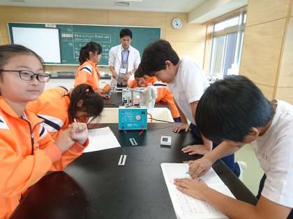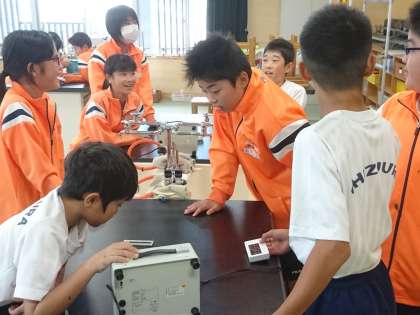 6年生は理科で「電気と私たちのくらし」という単元を学習しています。学習課題「電熱線は太さによって、熱エネルギーの発生は違うのか。」の解決に向け、検証を行っていました。