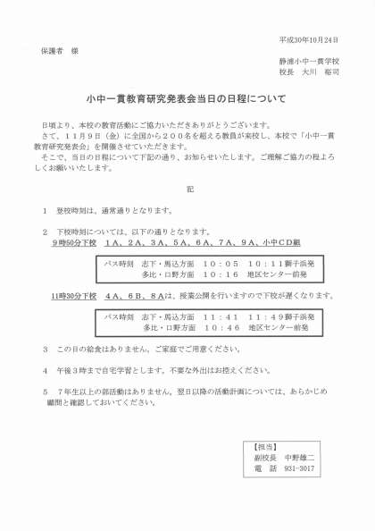 10/24(水) 小中一貫教育研究発表会当日の日程について