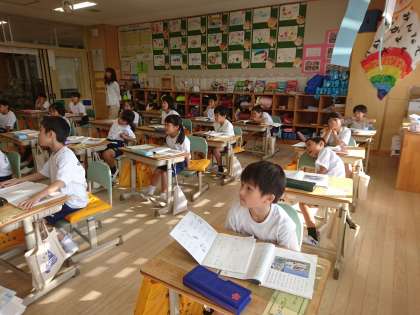 1年生は国語で「くらしをまもる車」という教材を学習しています。子どもたちは説明文の読み取りの仕方を熱心に学習しています。