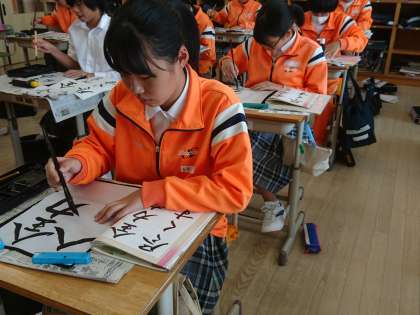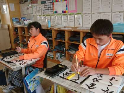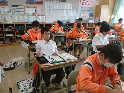 9年生は書写の時間において毛筆を行いました。毛筆では「全力を尽くす」という字を練習しています。