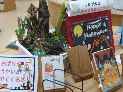 学校図書館の様子です。学校司書さんが作成したポップが子どもたちの目を引きつけます。