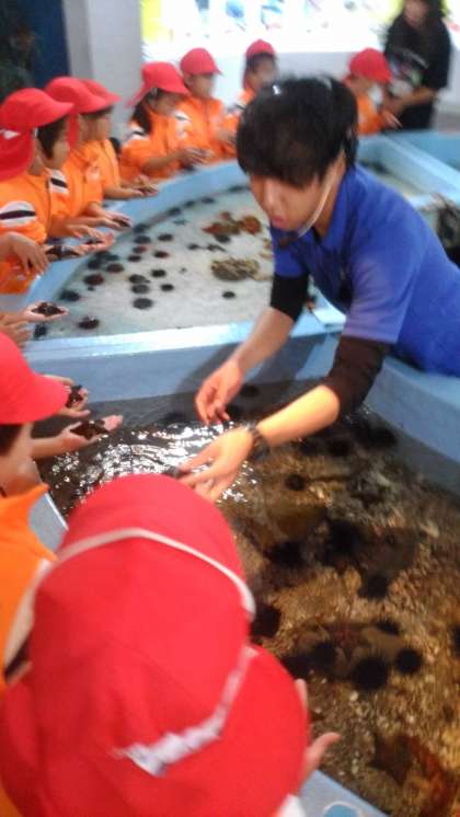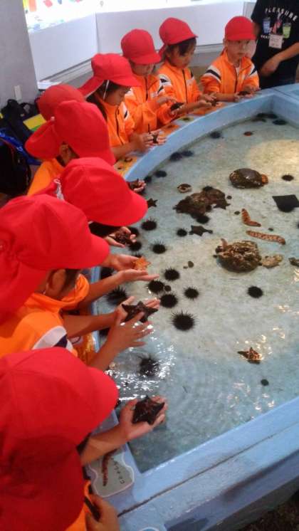あわしまマリンパークに到着しました。子どもたちはヒトデに触っています。