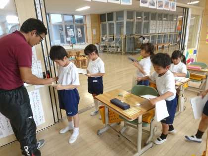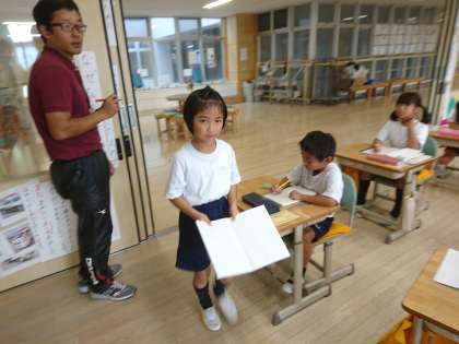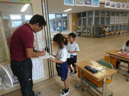 1年生は足し算を学習しています。足し算の解き方についてノートにまとめ、それを教員がチェックしています。