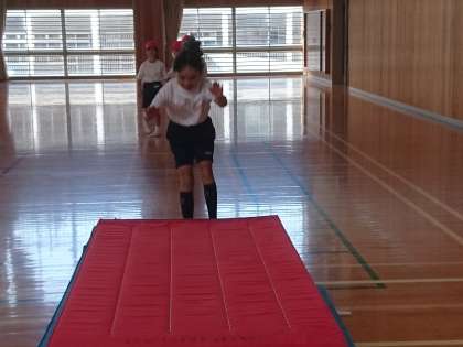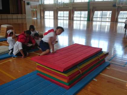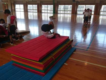 2年生は体育でマット運動を行っていました。今日は前転のテストをしました。みんな頑張っています。