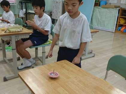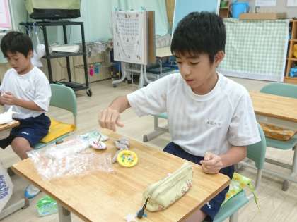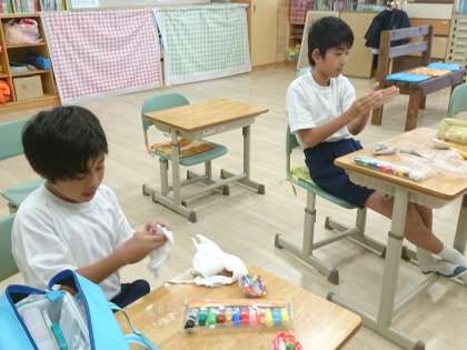 小C組は図工でこま作りを行っていました。紙粘土に色を塗る活動をしていました。