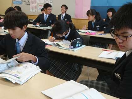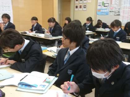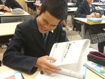 8年生は英語で「look+(形容詞)」の使い方を学習しました。人の表情を見て、第三者が「He looks happy.」などと表現していました。