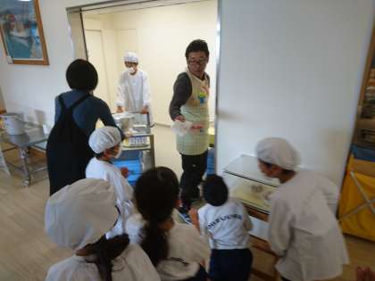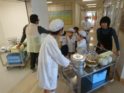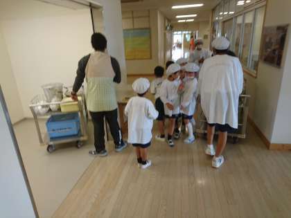 配膳室に給食用のワゴンを受け取りにきた給食係さんたちの様子です。
