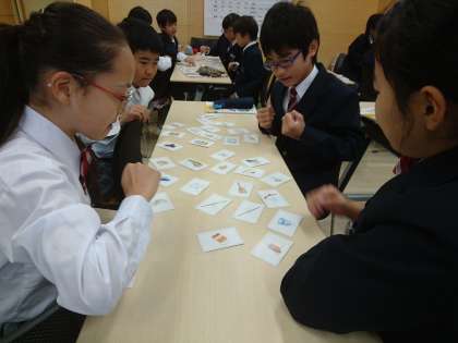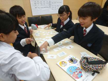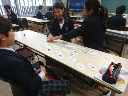 6年生は言語科「英語の時間」において、「My school trip」という単元を学習しています。最初にカルタゲームを楽しみ、活動がスタートしました。