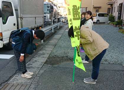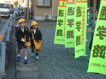 今朝、保護者の皆様による「PTA登校見守り隊」を実施しました。子どもたちも保護者の皆様や教員に大きな声で挨拶を交わしていました。