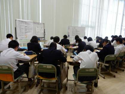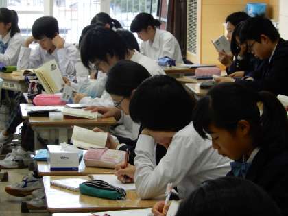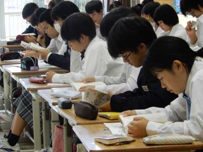 朝読書の様子です。研究授業の関係で、黒潮ホールに移動しています。