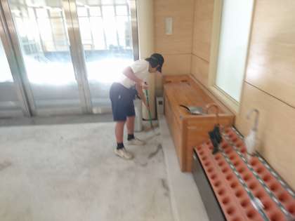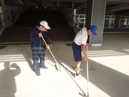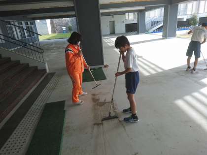 中C組は日常生活指導の時間において、1階ピロティから児童生徒玄関入り口まで掃き掃除を行っていました。皆さんのおかげで学校がとてもきれいになりました。ありがとうございました。