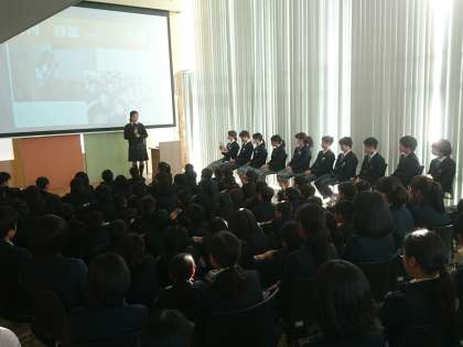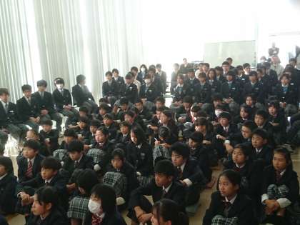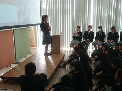 7日にようこそ先輩「夢」講座を開催し、本校卒業生から夢ある話をたくさんうかがいました。最初に登壇したのは日本大学三島高校1年生の先輩でした。児童生徒は、先輩の話を聞き入っていました。