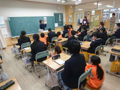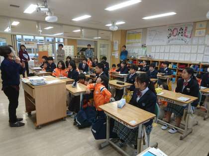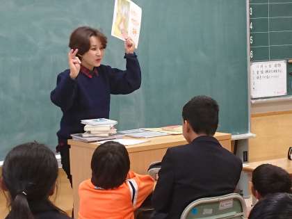 今朝、図書館司書によるブックトークが6年教室で行われました。これにはA・B組が参加し、本の世界に入りました。