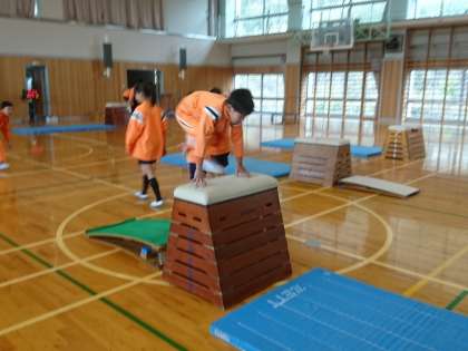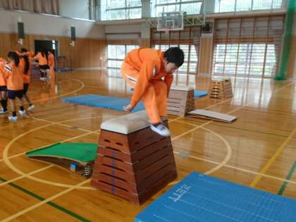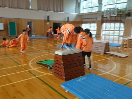 6年生は体育で跳び箱運動を行っていました。「かかえ込み跳び」を積極的に行っていました。