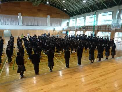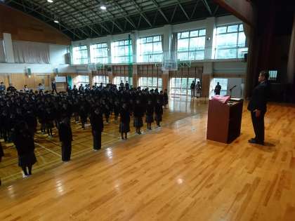 今朝、体育館で朝礼(表彰)を行いました。最初に自治会本部役員が前に立ち号令をかけ、校長先生と朝のあいさつを交わしました。